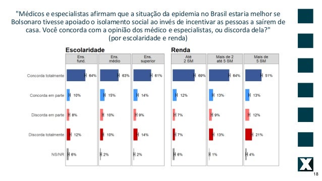 18. 18. "M�dicos e especialistas afirmam que a situa��o da epidemia no Brasil estaria melhor se Bolsonaro tivesse apoiado o isolamento social ao inv�s de incentivar as pessoas a sa�rem de casa. Voc� concorda com a opini�o dos m�dico e especialistas, ou discorda dela?" (por escolaridade e renda) 18