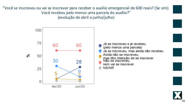 33. 33. "Voc� se inscreveu ou vai se inscrever para receber o aux�lio emergencial de 600 reais? (Se sim). Voc� recebeu pelo menos uma parcela do aux�lio?" (evolu��o de abril a junho/julho) 33