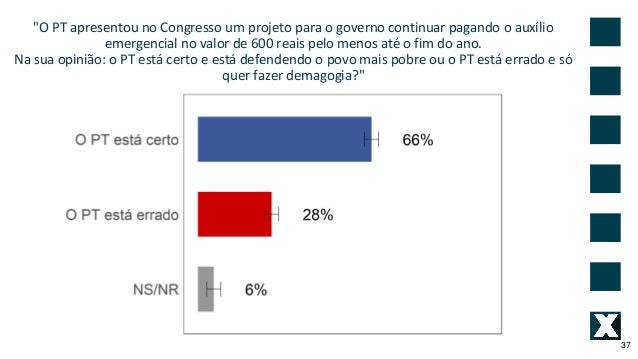 37. 37. "O PT apresentou no Congresso um projeto para o governo continuar pagando o aux�lio emergencial no valor de 600 reais pelo menos at� o fim do ano. Na sua opini�o: o PT est� certo e est� defendendo o povo mais pobre ou o PT est� errado e s� quer fazer demagogia?" 37