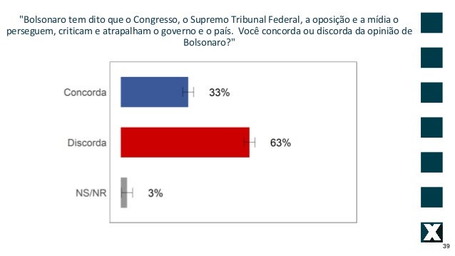 39. 39. "Bolsonaro tem dito que o Congresso, o Supremo Tribunal Federal, a oposi��o e a m�dia o perseguem, criticam e atrapalham o governo e o pa�s. Voc� concorda ou discorda da opini�o de Bolsonaro?" 39