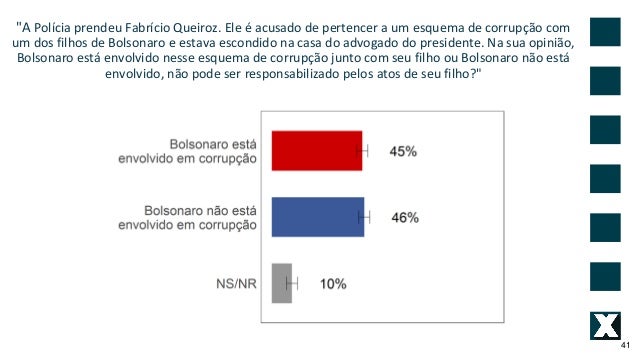 41. 41. "A Pol�cia prendeu Fabr�cio Queiroz. Ele � acusado de pertencer a um esquema de corrup��o com um dos filhos de Bolsonaro e estava escondido na casa do advogado do presidente. Na sua opini�o, Bolsonaro est� envolvido nesse esquema de corrup��o junto com seu filho ou Bolsonaro n�o est� envolvido, n�o pode ser responsabilizado pelos atos de seu filho?" 41