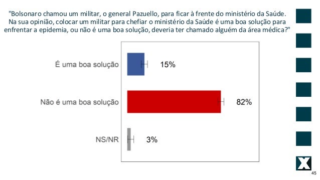 45. 45. "Bolsonaro chamou um militar, o general Pazuello, para ficar � frente do minist�rio da Sa�de. Na sua opini�o, colocar um militar para chefiar o minist�rio da Sa�de � uma boa solu��o para enfrentar a epidemia, ou n�o � uma boa solu��o, deveria ter chamado algu�m da �rea m�dica?" 45