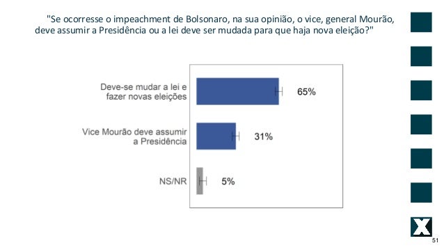 51. 51. "Se ocorresse o impeachment de Bolsonaro, na sua opini�o, o vice, general Mour�o, deve assumir a Presid�ncia ou a lei deve ser mudada para que haja nova elei��o?" 51