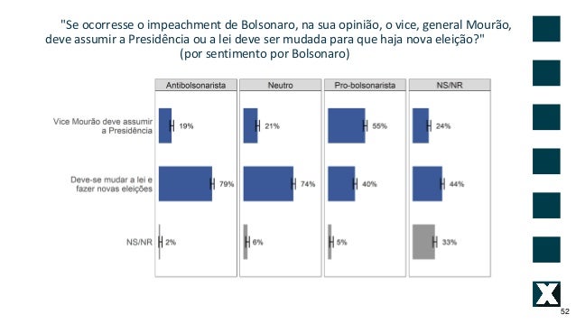 52. 52. "Se ocorresse o impeachment de Bolsonaro, na sua opini�o, o vice, general Mour�o, deve assumir a Presid�ncia ou a lei deve ser mudada para que haja nova elei��o?" (por sentimento por Bolsonaro) 52