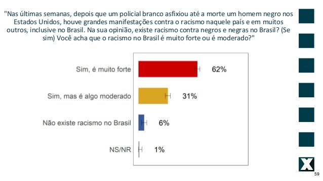 59. 59. "Nas �ltimas semanas, depois que um policial branco asfixiou at� a morte um homem negro nos Estados Unidos, houve grandes manifesta��es contra o racismo naquele pa�s e em muitos outros, inclusive no Brasil. Na sua opini�o, existe racismo contra negros e negras no Brasil? (Se sim) Voc� acha que o racismo no Brasil � muito forte ou � moderado?" 59