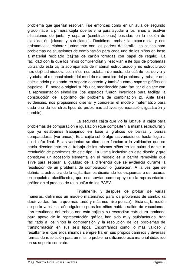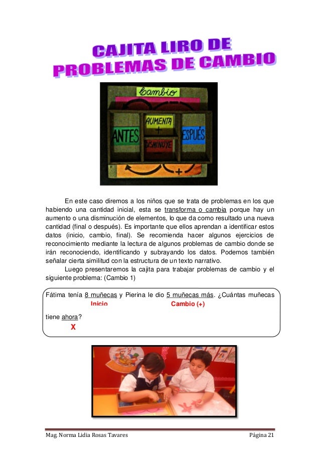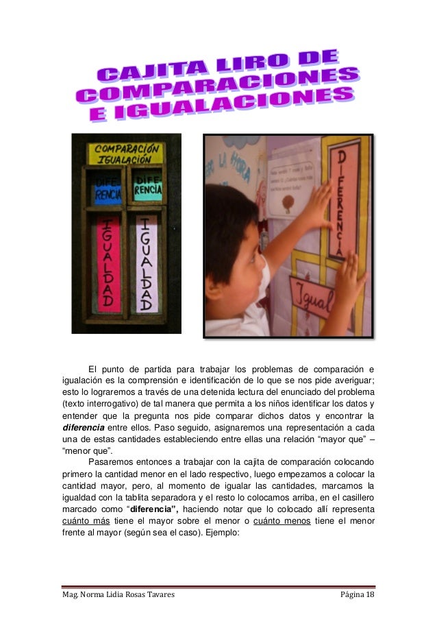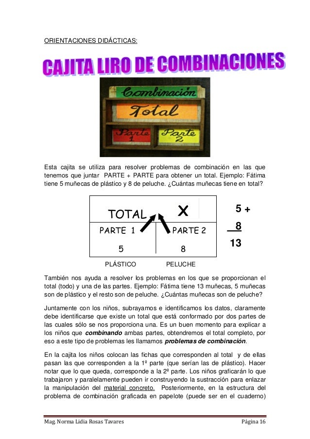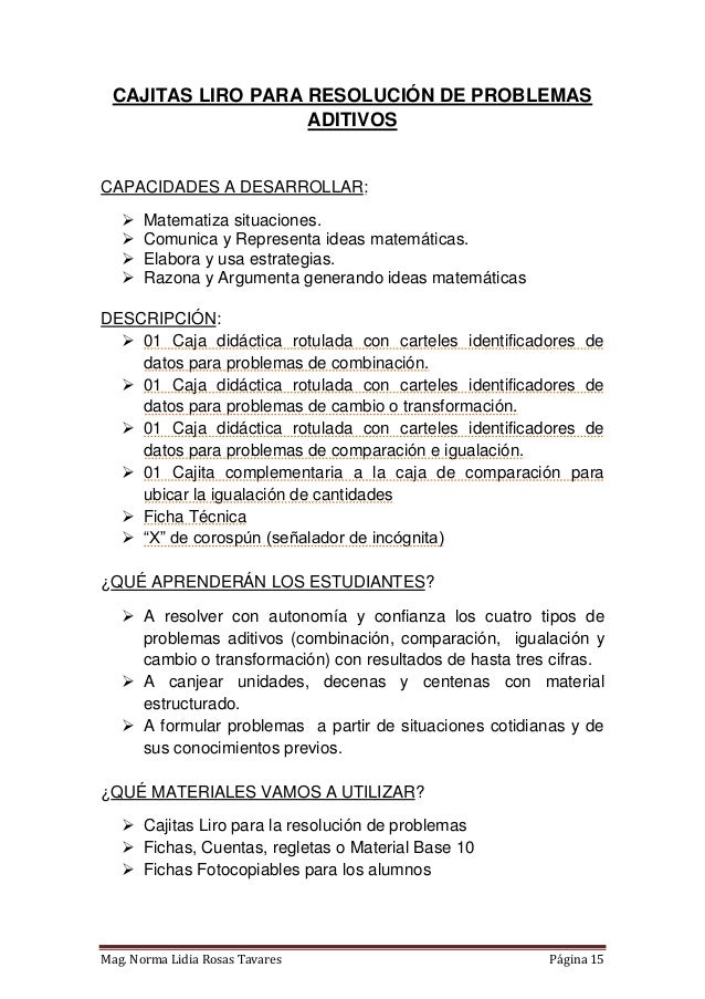 Propuesta de material didáctico estructurado que consta de tres cajas diseñadas a partir de modelos matemáticos para cada tipo de PAEV aditivo (combinación, cambio, comparación e igualación). Elaborado en Lima - Perú, tiene como finalidad contribuir al desarrollo de la capacidad de resolución de problemas en los niños del nivel primaria. El libro incluye un instructivo donde se proponen algunas de las varias estrategias que se pueden trabajar en las cajitas. Próximamente estaré compartiendo también las fichas para fotocopiar y materiales autoinstructivos.