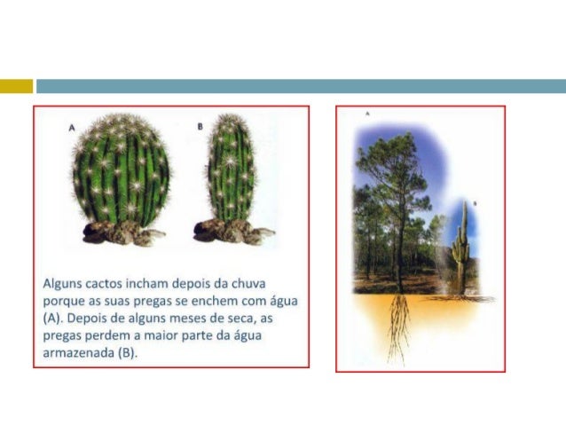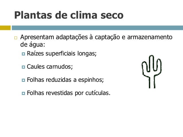 11. 11. Plantas de clima seco  Apresentam adaptações à captação e armazenamento de água:  Raízes superficiais longas;  Caules carnudos;  Folhas reduzidas a espinhos;  Folhas revestidas por cutículas.