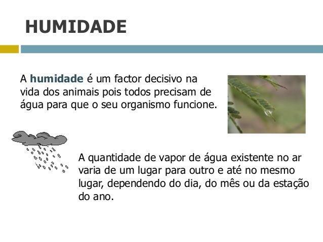 3. 3. HUMIDADE A quantidade de vapor de água existente no ar varia de um lugar para outro e até no mesmo lugar, dependendo do dia, do mês ou da estação do ano. A humidade é um factor decisivo na vida dos animais pois todos precisam de água para que o seu organismo funcione.