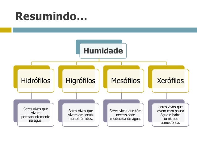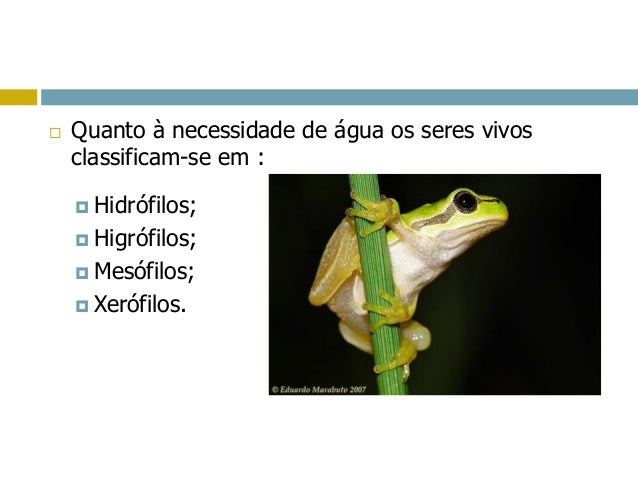 4. 4.  Quanto à necessidade de água os seres vivos classificam-se em :  Hidrófilos;  Higrófilos;  Mesófilos;  Xerófilos.