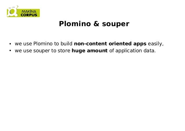17. 17. Plomino & souper ● we use Plomino to build non-content oriented apps easily, ● we use souper to store huge amount of application data.