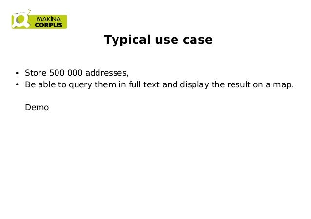 21. 21. Typical use case ● Store 500 000 addresses, ● Be able to query them in full text and display the result on a map. Demo