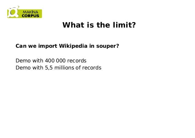 22. 22. What is the limit? Can we import Wikipedia in souper? Demo with 400 000 records Demo with 5,5 millions of records