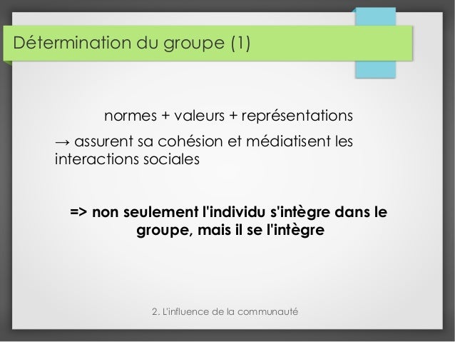 10. 10. Détermination du groupe (1) normes + valeurs + représentations → assurent sa cohésion et médiatisent les interactions sociales => non seulement l'individu s'intègre dans le groupe, mais il se l'intègre 2. L'influence de la communauté