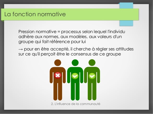 12. 12. La fonction normative Pression normative = processus selon lequel l'individu adhère aux normes, aux modèles, aux valeurs d'un groupe qui fait référence pour lui → pour en être accepté, il cherche à régler ses attitudes sur ce qu'il perçoit être le consensus de ce groupe 2. L'influence de la communauté