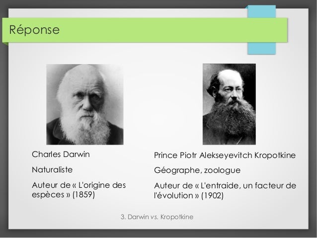 17. 17. Réponse 3. Darwin vs. Kropotkine Charles Darwin Naturaliste Auteur de « L'origine des espèces » (1859) Prince Piotr Alekseyevitch Kropotkine Géographe, zoologue Auteur de « L'entraide, un facteur de l'évolution » (1902)