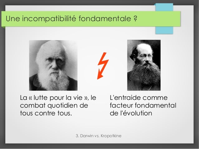 18. 18. Une incompatibilité fondamentale ? 3. Darwin vs. Kropotkine La « lutte pour la vie », le combat quotidien de tous contre tous. L'entraide comme facteur fondamental de l'évolution