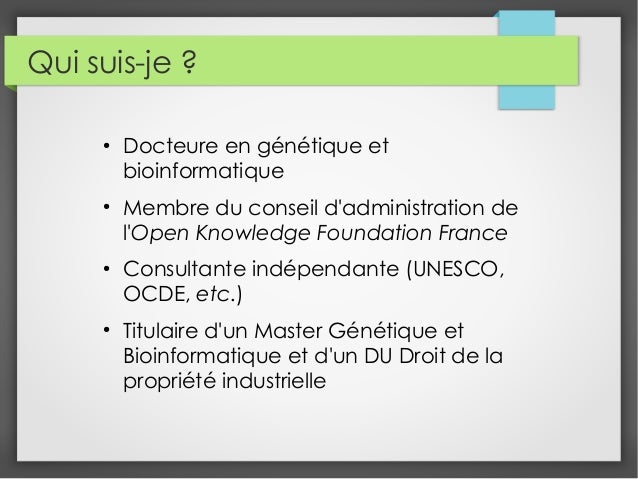 2. 2. Qui suis-je ? ● Docteure en génétique et bioinformatique ● Membre du conseil d'administration de l'Open Knowledge Foundation France ● Consultante indépendante (UNESCO, OCDE, etc.) ● Titulaire d'un Master Génétique et Bioinformatique et d'un DU Droit de la propriété industrielle