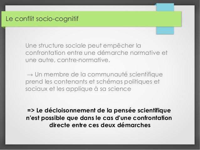 22. 22. Le conflit socio-cognitif Une structure sociale peut empêcher la confrontation entre une démarche normative et une autre, contre-normative. → Un membre de la communauté scientifique prend les contenants et schémas politiques et sociaux et les applique à sa science => Le décloisonnement de la pensée scientifique n'est possible que dans le cas d'une confrontation directe entre ces deux démarches