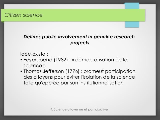 23. 23. Citizen science 4. Science citoyenne et participative Defines public involvement in genuine research projects Idée existe : ● Feyerabend (1982) : « démocratisation de la science » ● Thomas Jefferson (1776) : promeut participation des citoyens pour éviter l'isolation de la science telle qu'opérée par son institutionnalisation