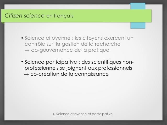 26. 26. Citizen science en français 4. Science citoyenne et participative ● Science citoyenne : les citoyens exercent un contrôle sur la gestion de la recherche → co-gouvernance de la pratique ● Science participative : des scientifiques non- professionnels se joignent aux professionnels → co-création de la connaissance => la science devient partie intégrale de la vie quotidienne