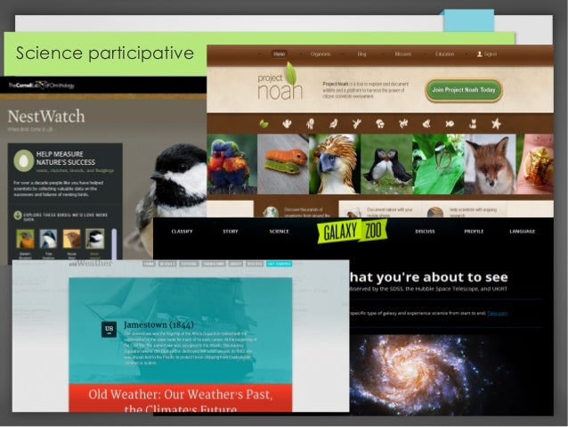 28. 28. Science participative 4. Science citoyenne et participative Un glissement dans l'engagement du public : citoyens ne sont plus limités à la tâche subalterne de collecte de données → citoyens deviennent des scientifiques (analyse de données, génération d'hypothèses)