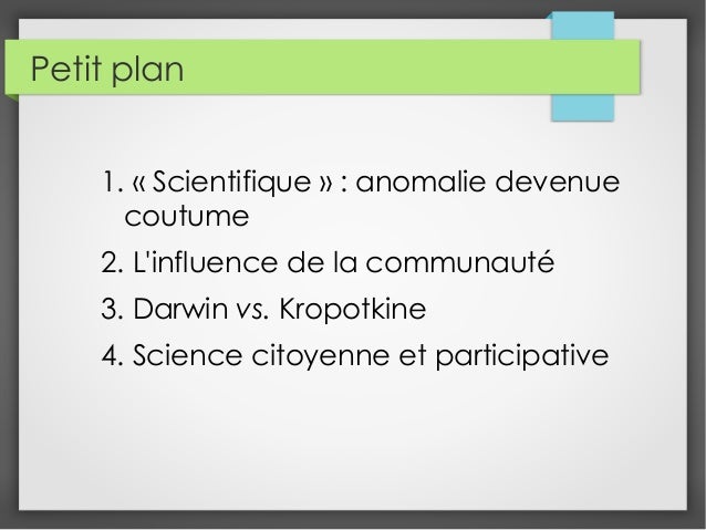 3. 3. Petit plan 1. « Scientifique » : anomalie devenue coutume 2. L'influence de la communauté 3. Darwin vs. Kropotkine 4. Science citoyenne et participative