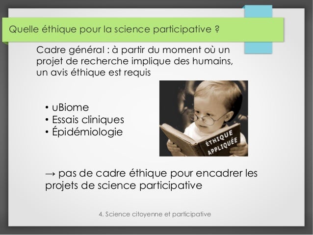 30. 30. Quelle éthique pour la science participative ? 4. Science citoyenne et participative Cadre général : à partir du moment où un projet de recherche implique des humains, un avis éthique est requis ● uBiome ● Essais cliniques ● Épidémiologie → pas de cadre éthique pour encadrer les projets de science participative