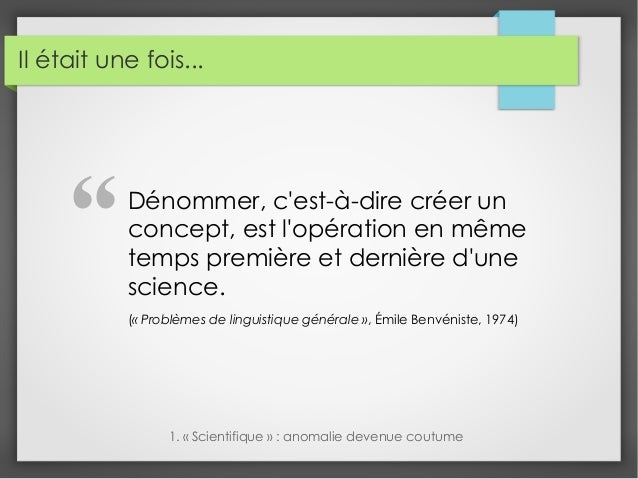 4. 4. Il était une fois... Dénommer, c'est-à-dire créer un concept, est l'opération en même temps première et dernière d'une science. (« Problèmes de linguistique générale », Émile Benvéniste, 1974) 1. « Scientifique » : anomalie devenue coutume "
