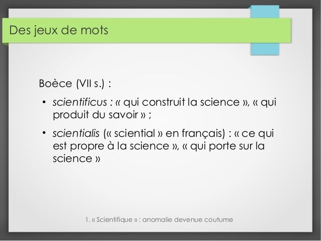 7. 7. Des jeux de mots Boèce (VII s.) : ● scientificus : « qui construit la science », « qui produit du savoir » ; ● scientialis (« sciential » en français) : « ce qui est propre à la science », « qui porte sur la science » 1. « Scientifique » : anomalie devenue coutume