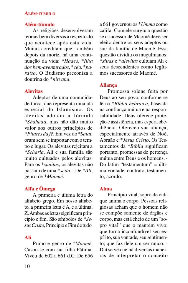 9. 9. 10 Além-túmulo As religiões desenvolveram teorias bem diversas a respeito do que acontece após esta vida. Muitas acreditam que, também depois da morte, há uma conti- nuação da vida: *Hades, *Ilha dos bem-aventurados, *céu, *pa- raíso. O Budismo preconiza a doutrina do *nirvana. Alevitas Adeptos de uma comunida- de turca, que representa uma ala especial do Islamismo. Os alevitas adotam a fórmula *Shahada, mas não dão muito valor aos outros princípios de *Pilares da fé. Em vez do *Salat, oram sem se importar com o tem- po e lugar. Os alevitas rejeitam a *Scharia. Ali e sua família são muito cultuados pelos alevitas. Para os *sunitas, os alevitas não passam de uma *seita. - De *Ali, genro de *Maomé. Alfa e Ômega A primeira e última letra do alfabeto grego. Em nosso alfabe- to, a primeira letra éA, e a última, Z.Ambasasletrassignificamprin- cípio e fim. São símbolos de *Je- susCristo,PrincípioeFimdetudo. Ali Primo e genro de *Maomé. Casou-se com sua filha Fátima. Viveu de 602 a 661 d.C. De 656 a 661 governou os *Umma como califa. Com ele surgiu a questão se o sucessor de Maomé deve ser eleito dentre os seus adeptos ou sair da família de Maomé. Essa questão dividiu os muçulmanos: *xiitas e *alevitas cultuam Ali e seus descendentes como legíti- mos sucessores de Maomé. Aliança Promessa solene feita por Deus ao seu povo, conforme se lê na *Bíblia hebraica, baseada na confiança mútua e na respon- sabilidade. Deus oferece prote- ção e assistência, mas espera obe- diência. Ofereceu sua aliança, especialmente através de Noé, Abraão e *Jesus Cristo. Os Tes- tamentos da *Bíblia significam portanto, promessas de pertença mútua entre Deus e os homens. - Do latim “testamentum” = últi- ma vontade, contrato, testamen- to, acordo. Alma Princípio vital, sopro de vida que anima o corpo. Pessoas reli- giosas acham que o homem não se compõe somente de órgãos e corpo, mas está cheio de um “so- pro vital” que o mantém vivo; que torna inconfundível seu es- pírito, sua vontade, seu sentimen- to; que faz dele um ser único. - Daí se vê que há diversas manei- ras de interpretar o conceito ALÉM-TÚMULO