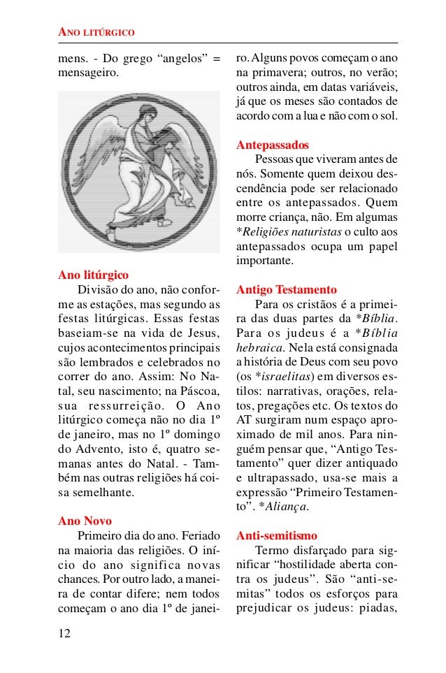 11. 11. 12 mens. - Do grego “angelos” = mensageiro. Ano litúrgico Divisão do ano, não confor- me as estações, mas segundo as festas litúrgicas. Essas festas baseiam-se na vida de Jesus, cujos acontecimentos principais são lembrados e celebrados no correr do ano. Assim: No Na- tal, seu nascimento; na Páscoa, sua ressurreição. O Ano litúrgico começa não no dia 1º de janeiro, mas no 1º domingo do Advento, isto é, quatro se- manas antes do Natal. - Tam- bém nas outras religiões há coi- sa semelhante. Ano Novo Primeiro dia do ano. Feriado na maioria das religiões. O iní- cio do ano significa novas chances. Por outro lado, a manei- ra de contar difere; nem todos começam o ano dia 1º de janei- ro.Alguns povos começam o ano na primavera; outros, no verão; outros ainda, em datas variáveis, já que os meses são contados de acordo com a lua e não com o sol. Antepassados Pessoas que viveram antes de nós. Somente quem deixou des- cendência pode ser relacionado entre os antepassados. Quem morre criança, não. Em algumas *Religiões naturistas o culto aos antepassados ocupa um papel importante. Antigo Testamento Para os cristãos é a primei- ra das duas partes da *Bíblia. Para os judeus é a *Bíblia hebraica. Nela está consignada a história de Deus com seu povo (os *israelitas) em diversos es- tilos: narrativas, orações, rela- tos, pregações etc. Os textos do AT surgiram num espaço apro- ximado de mil anos. Para nin- guém pensar que, “Antigo Tes- tamento” quer dizer antiquado e ultrapassado, usa-se mais a expressão “Primeiro Testamen- to”. *Aliança. Anti-semitismo Termo disfarçado para sig- nificar “hostilidade aberta con- tra os judeus”. São “anti-se- mitas” todos os esforços para prejudicar os judeus: piadas, ANO LITÚRGICO