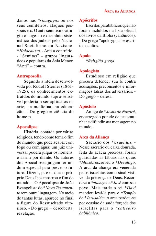 12. 12. 13 danos nas *sinagogas ou nos seus cemitérios, ataques pes- soais etc. O anti-semitismo atin- giu o auge no extermínio siste- mático dos judeus pelo Nacio- nal-Socialismo ou Nazismo. *Holocausto. - Anti = contrário. - “Semitas” = grupos lingüís- ticos e populares da Ásia Menor. “Anti” = contra. Antroposofia Segundo a idéia desenvol- vida por Rudolf Steiner (1861- 1925), os conhecimentos ex- traídos do mundo supra-sensí- vel poderiam ser aplicados na arte, na medicina, na educa- ção. - Do grego = ciência do homem. Apocalipse História, contada por várias religiões, tendo como tema o fim do mundo; que pode acabar com fogo ou com água; um juiz uni- versal poderá julgar os homens, e assim por diante. Os autores dos Apocalipses julgam ter um dom especial para prever o fu- turo. Dizem, p. ex., que o pró- prio Deus lhes mostrou o fim do mundo. - O Apocalipse de João Evangelista do *Novo Testamen- to tem outra linguagem. No meio de tantas lutas, aparece no final a figura do Ressuscitado vito- rioso. - Do grego = descoberta, revelação. Apócrifos Escritos parabíblicos que não foram incluídos na lista oficial dos livros da Bíblia (canônicos). - Do grego “apokrypha” = escri- tos ocultos. Apolo *Religião grega. Apologista Estudioso em religião que procura defender sua fé contra acusações, preconceitos e infor- mações falsas dos adversários. - Do grego = defesa. Apóstolo Amigo de *Jesus de Nazaré, encarregado por ele de testemu- nhar e difundir sua mensagem no mundo. Arca da Aliança Sacrário dos *israelitas. - Nesse sacrário ou caixa dourada, feita de acácia preciosa, foram guardadas as tábuas nas quais *Moisés escreveu o *Decálogo. A arca da aliança era venerada pelos israelitas como sinal visí- vel da presença de Deus. Recor- dava a *aliança de *Javé com seu povo. Mais tarde o rei *Davi mandou levá-la para o *Templo de *Jerusalém. A arca perdeu-se por ocasião da saída forçada dos israelitas para o *cativeiro babilônico. ARCA DA ALIANÇA