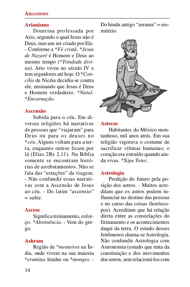 13. 13. 14 Arianismo Doutrina professada por Ario, segundo o qual Jesus não é Deus, mas um ser criado por Ele. - Conforme a *Fé cristã, *Jesus de Nazaré é Homem e Deus ao mesmo tempo (*Trindade divi- na). Ario viveu no século IV e tem seguidores até hoje. O *Con- cílio de Nicéia decidiu-se contra ele, ensinando que Jesus é Deus e Homem verdadeiro. *Natal. *Encarnação. Ascensão Subida para o céu. Em di- versas religiões há narrativas de pessoas que “viajaram” para Deus ou para os deuses no *céu. Alguns voltam para a ter- ra, enquanto outros ficam por lá (Elias 2Rs 2,11). Na Bíblia somente se encontram histó- rias de arrebatamentos. Não se fala das “estações” da viagem. - Não confundir essas narrati- vas com a Ascensão de Jesus ao céu. - Do latim “ascensio” = subir. Ascese Significa treinamento, esfor- ço. *Abstinência. - Vem do gre- go. Ashram Região de *mosteiros na Ín- dia, onde vivem na sua maioria *eremitas hindus ou *monges. - Do hindu antigo “asrama” = ere- mitério. Astecas Habitantes do México mon- tanhoso, mil anos atrás. Em sua religião vigorava o costume de sacrificar vítimas humanas; o coração era extraído quando ain- da vivas. *Xipe Totec. Astrologia Predição do futuro pela po- sição dos astros. - Muitos acre- ditam que os astros podem in- fluenciar no destino das pessoas e no curso das coisas (horósco- pos). Acreditam que há relação direta entre as constelações do firmamento e os acontecimentos daqui da terra. O estudo desses fenômenos chama-seAstrologia. Não confundir Astrologia com Astronomia (estudo que trata da constituição e dos movimentos dos astros, sem relacioná-los com ARIANISMO