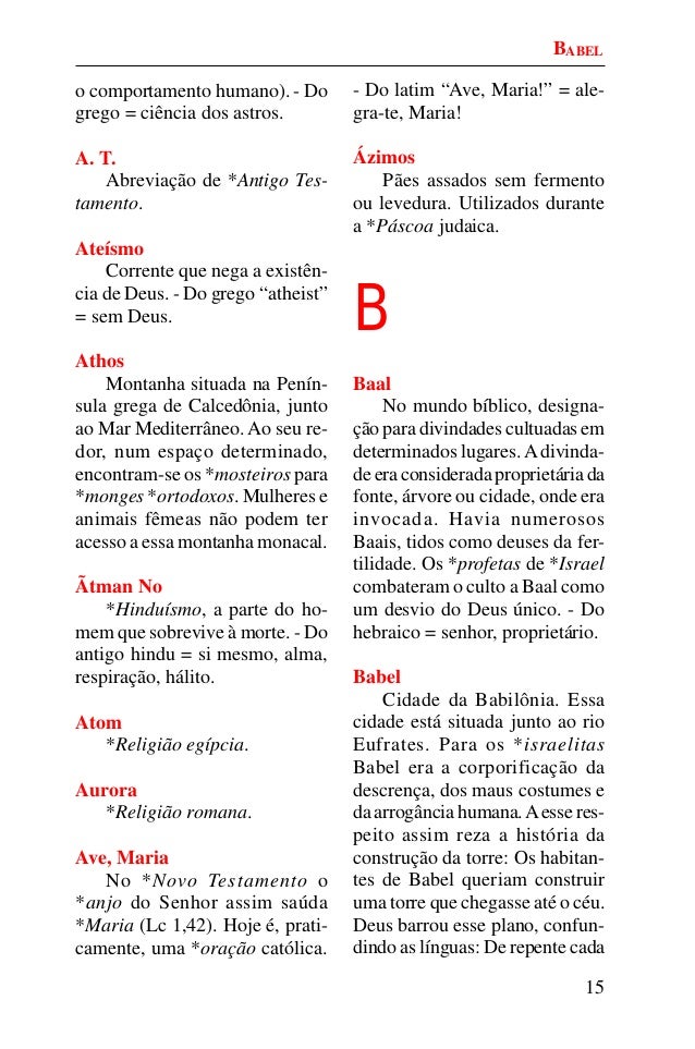 14. 14. 15 o comportamento humano). - Do grego = ciência dos astros. A. T. Abreviação de *Antigo Tes- tamento. Ateísmo Corrente que nega a existên- cia de Deus. - Do grego “atheist” = sem Deus. Athos Montanha situada na Penín- sula grega de Calcedônia, junto ao Mar Mediterrâneo. Ao seu re- dor, num espaço determinado, encontram-se os *mosteiros para *monges *ortodoxos. Mulheres e animais fêmeas não podem ter acesso a essa montanha monacal. Ãtman No *Hinduísmo, a parte do ho- mem que sobrevive à morte. - Do antigo hindu = si mesmo, alma, respiração, hálito. Atom *Religião egípcia. Aurora *Religião romana. Ave, Maria No *Novo Testamento o *anjo do Senhor assim saúda *Maria (Lc 1,42). Hoje é, prati- camente, uma *oração católica. - Do latim “Ave, Maria!” = ale- gra-te, Maria! Ázimos Pães assados sem fermento ou levedura. Utilizados durante a *Páscoa judaica. B Baal No mundo bíblico, designa- ção para divindades cultuadas em determinados lugares.Adivinda- de era considerada proprietária da fonte, árvore ou cidade, onde era invocada. Havia numerosos Baais, tidos como deuses da fer- tilidade. Os *profetas de *Israel combateram o culto a Baal como um desvio do Deus único. - Do hebraico = senhor, proprietário. Babel Cidade da Babilônia. Essa cidade está situada junto ao rio Eufrates. Para os *israelitas Babel era a corporificação da descrença, dos maus costumes e da arrogância humana.Aesse res- peito assim reza a história da construção da torre: Os habitan- tes de Babel queriam construir uma torre que chegasse até o céu. Deus barrou esse plano, confun- dindo as línguas: De repente cada BABEL
