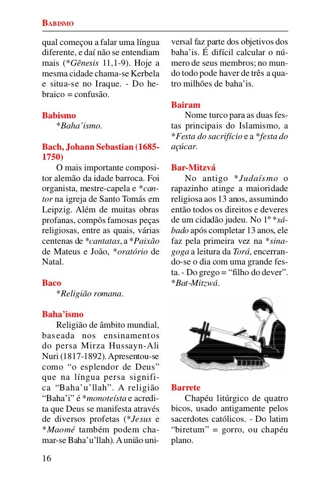 15. 15. 16 qual começou a falar uma língua diferente, e daí não se entendiam mais (*Gênesis 11,1-9). Hoje a mesma cidade chama-se Kerbela e situa-se no Iraque. - Do he- braico = confusão. Babismo *Baha’ismo. Bach, Johann Sebastian (1685- 1750) O mais importante composi- tor alemão da idade barroca. Foi organista, mestre-capela e *can- tor na igreja de Santo Tomás em Leipzig. Além de muitas obras profanas, compôs famosas peças religiosas, entre as quais, várias centenas de *cantatas, a *Paixão de Mateus e João, *oratório de Natal. Baco *Religião romana. Baha’ismo Religião de âmbito mundial, baseada nos ensinamentos do persa Mirza Hussayn-Ali Nuri (1817-1892).Apresentou-se como “o esplendor de Deus” que na língua persa signifi- ca “Baha’u’llah”. A religião “Baha’i” é *monoteísta e acredi- ta que Deus se manifesta através de diversos profetas (*Jesus e *Maomé também podem cha- mar-se Baha’u’llah).Aunião uni- versal faz parte dos objetivos dos baha’is. É difícil calcular o nú- mero de seus membros; no mun- do todo pode haver de três a qua- tro milhões de baha’is. Bairam Nome turco para as duas fes- tas principais do Islamismo, a *Festa do sacrifício e a *festa do açúcar. Bar-Mitzvá No antigo *Judaísmo o rapazinho atinge a maioridade religiosa aos 13 anos, assumindo então todos os direitos e deveres de um cidadão judeu. No 1º *sá- bado após completar 13 anos, ele faz pela primeira vez na *sina- goga a leitura da Torá, encerran- do-se o dia com uma grande fes- ta. - Do grego = “filho do dever”. *Bat-Mitzwá. Barrete Chapéu litúrgico de quatro bicos, usado antigamente pelos sacerdotes católicos. - Do latim “biretum” = gorro, ou chapéu plano. BABISMO