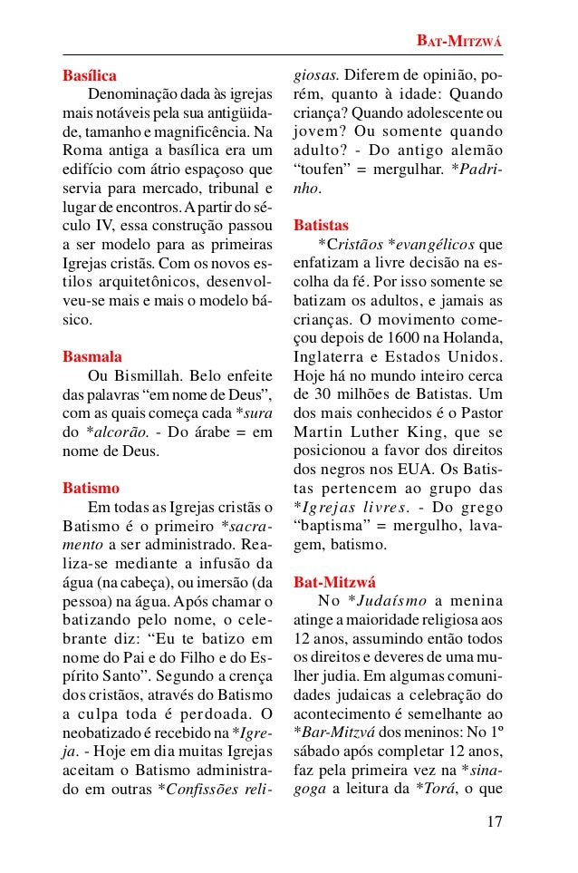 16. 16. 17 Basílica Denominação dada às igrejas mais notáveis pela sua antigüida- de, tamanho e magnificência. Na Roma antiga a basílica era um edifício com átrio espaçoso que servia para mercado, tribunal e lugar de encontros.Apartir do sé- culo IV, essa construção passou a ser modelo para as primeiras Igrejas cristãs. Com os novos es- tilos arquitetônicos, desenvol- veu-se mais e mais o modelo bá- sico. Basmala Ou Bismillah. Belo enfeite das palavras “em nome de Deus”, com as quais começa cada *sura do *alcorão. - Do árabe = em nome de Deus. Batismo Em todas as Igrejas cristãs o Batismo é o primeiro *sacra- mento a ser administrado. Rea- liza-se mediante a infusão da água (na cabeça), ou imersão (da pessoa) na água. Após chamar o batizando pelo nome, o cele- brante diz: “Eu te batizo em nome do Pai e do Filho e do Es- pírito Santo”. Segundo a crença dos cristãos, através do Batismo a culpa toda é perdoada. O neobatizado é recebido na *Igre- ja. - Hoje em dia muitas Igrejas aceitam o Batismo administra- do em outras *Confissões reli- giosas. Diferem de opinião, po- rém, quanto à idade: Quando criança? Quando adolescente ou jovem? Ou somente quando adulto? - Do antigo alemão “toufen” = mergulhar. *Padri- nho. Batistas *Cristãos *evangélicos que enfatizam a livre decisão na es- colha da fé. Por isso somente se batizam os adultos, e jamais as crianças. O movimento come- çou depois de 1600 na Holanda, Inglaterra e Estados Unidos. Hoje há no mundo inteiro cerca de 30 milhões de Batistas. Um dos mais conhecidos é o Pastor Martin Luther King, que se posicionou a favor dos direitos dos negros nos EUA. Os Batis- tas pertencem ao grupo das *Igrejas livres. - Do grego “baptisma” = mergulho, lava- gem, batismo. Bat-Mitzwá No *Judaísmo a menina atinge a maioridade religiosa aos 12 anos, assumindo então todos os direitos e deveres de uma mu- lher judia. Em algumas comuni- dades judaicas a celebração do acontecimento é semelhante ao *Bar-Mitzvá dos meninos: No 1º sábado após completar 12 anos, faz pela primeira vez na *sina- goga a leitura da *Torá, o que BAT-MITZWÁ