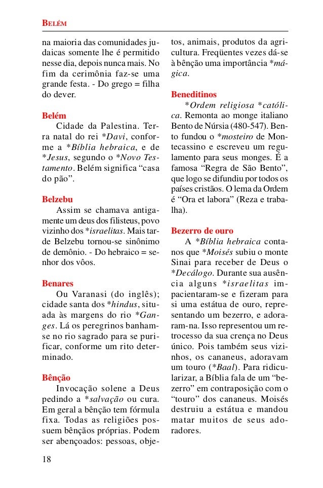 17. 17. 18 na maioria das comunidades ju- daicas somente lhe é permitido nesse dia, depois nunca mais. No fim da cerimônia faz-se uma grande festa. - Do grego = filha do dever. Belém Cidade da Palestina. Ter- ra natal do rei *Davi, confor- me a *Bíblia hebraica, e de *Jesus, segundo o *Novo Tes- tamento. Belém significa “casa do pão”. Belzebu Assim se chamava antiga- mente um deus dos filisteus, povo vizinho dos *israelitas. Mais tar- de Belzebu tornou-se sinônimo de demônio. - Do hebraico = se- nhor dos vôos. Benares Ou Varanasi (do inglês); cidade santa dos *hindus, situ- ada às margens do rio *Gan- ges. Lá os peregrinos banham- se no rio sagrado para se puri- ficar, conforme um rito deter- minado. Bênção Invocação solene a Deus pedindo a *salvação ou cura. Em geral a bênção tem fórmula fixa. Todas as religiões pos- suem bênçãos próprias. Podem ser abençoados: pessoas, obje- tos, animais, produtos da agri- cultura. Freqüentes vezes dá-se à bênção uma importância *má- gica. Beneditinos *Ordem religiosa *católi- ca. Remonta ao monge italiano Bento de Núrsia (480-547). Ben- to fundou o *mosteiro de Mon- tecassino e escreveu um regu- lamento para seus monges. É a famosa “Regra de São Bento”, que logo se difundiu por todos os países cristãos. O lema da Ordem é “Ora et labora” (Reza e traba- lha). Bezerro de ouro A *Bíblia hebraica conta- nos que *Moisés subiu o monte Sinai para receber de Deus o *Decálogo. Durante sua ausên- cia alguns *israelitas im- pacientaram-se e fizeram para si uma estátua de ouro, repre- sentando um bezerro, e adora- ram-na. Isso representou um re- trocesso da sua crença no Deus único. Pois também seus vizi- nhos, os cananeus, adoravam um touro (*Baal). Para ridicu- larizar, a Bíblia fala de um “be- zerro” em contraposição com o “touro” dos cananeus. Moisés destruiu a estátua e mandou matar muitos de seus ado- radores. BELÉM