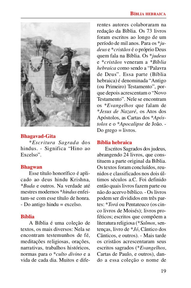 18. 18. 19 Bhagavad-Gita *Escritura Sagrada dos hindus. - Significa “Hino ao Excelso”. Bhagwan Esse título honorífico é apli- cado ao deus hindu Krishna, *Buda e outros. Na verdade até mestres modernos *hindus enfei- tam-se com esse título de honra. - Do antigo hindu = excelso. Bíblia A Bíblia é uma coleção de textos, os mais diversos: Nela se encontram testemunhos de fé, meditações religiosas, orações, narrativas, trabalhos históricos, normas para o *culto divino e a vida de cada dia. Muitos e dife- rentes autores colaboraram na redação da Bíblia. Os 73 livros foram escritos ao longo de um período de mil anos. Para os *ju- deus e *cristãos é o próprio Deus quem fala na Bíblia. Os *judeus e *cristãos veneram a *Bíblia hebraica como sendo a “Palavra de Deus”. Essa parte (Bíblia hebraica) é denominada “Antigo (ou Primeiro) Testamento”, por- que depois acrescentam o “Novo Testamento”. Nele se encontram os *Evangelhos que falam de *Jesus de Nazaré, os Atos dos Apóstolos, as Cartas dos *Após- tolos e o *Apocalipse de João. - Do grego = livros. Bíblia hebraica Escritos Sagrados dos judeus, abrangendo 24 livros, que cons- tituem a parte original da Bíblia. Os textos foram concluídos, reu- nidos e classificados nos dois úl- timos séculos a.C. Foi definido então quais livros fazem parte ou não do acervo bíblico. - Os livros podem ser divididos em três par- tes: *Torá ou Pentateuco (os cin- co livros de Moisés); livros pro- féticos; escritos que compõem a literatura religiosa (*Salmos, sen- tenças, livro de *Jó, Cântico dos Cânticos, e outros). - Mais tarde os cristãos acrescentaram seus escritos sagrados (*Evangelhos, Cartas de Paulo, e outros), dan- do a essa coleção o nome de BÍBLIA HEBRAICA