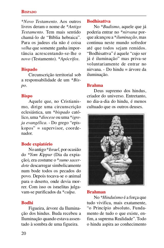 19. 19. 20 *Novo Testamento. Aos outros livros deram o nome de *Antigo Testamento. Tem mais sentido chamá-lo de “Bíblia hebraica”. Para os judeus ela não é coisa velha que somente ganha impor- tância acrescentando-se-lhe o novo (Testamento). *Apócrifos. Bispado Circunscrição territorial sob a responsabilidade de um *Bis- po. Bispo Aquele que, no Cristianis- mo, dirige uma circunscrição eclesiástica, um *bispado cató- lico, uma *diocese ou uma *igre- ja evangélica. - Do grego “epis- kopos” = supervisor, coorde- nador. Bode expiatório Noantigo*Israel,porocasião do *Yom Kippur (Dia da expia- ção), era costume o *sumo sacer- dote descarregar simbolicamente num bode todos os pecados do povo. Depois tocava-se o animal para o deserto, onde devia mor- rer. Com isso os israelitas julga- vam-se purificados da *culpa. Bodhi Figueira, árvore da Ilumina- ção dos hindus. Buda recebeu a Iluminação quando estava assen- tado à sombra de uma figueira. Bodhisattva No *Budismo, aquele que já poderia entrar no *nirvana por- que alcançou a *iluminação, mas continua neste mundo sofredor até que todos sejam remidos. “Bodhisattva” é aquele “cujo ser já é iluminação” mas priva-se voluntariamente de entrar no nirvana. - Do hindu = árvore da iluminação. Brahma Deus supremo dos hindus, criador do universo. Entretanto, no dia-a-dia do hindu, é menos cultuado que os outros deuses. Brahman No *Hinduísmo é a força que tudo vivifica, mais exatamente, “o Princípio absoluto, Funda- mento de tudo o que existe, en- fim, a suprema Realidade”. Todo o hindu aspira ao conhecimento BISPADO