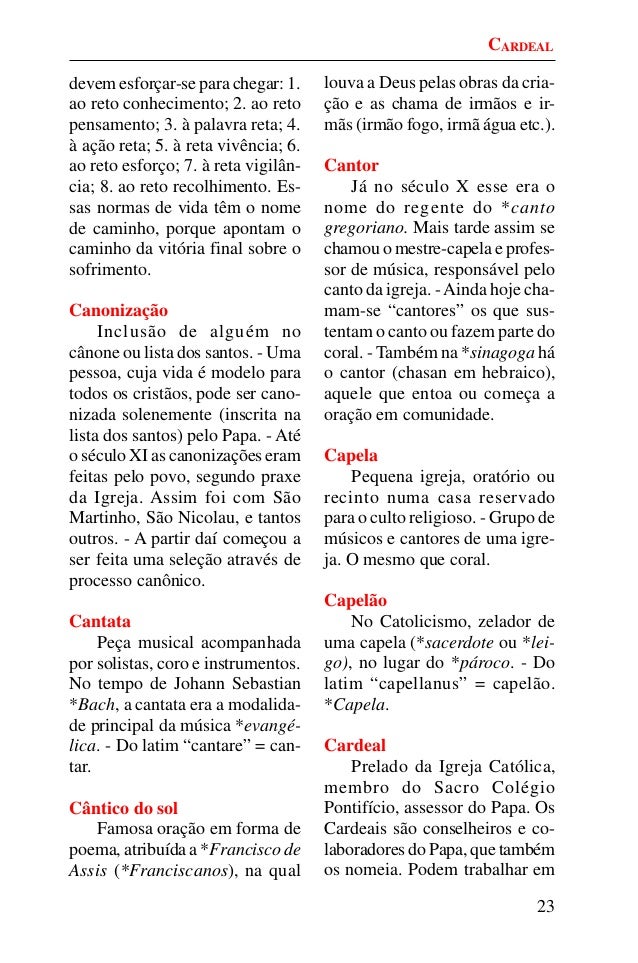 22. 22. 23 devem esforçar-se para chegar: 1. ao reto conhecimento; 2. ao reto pensamento; 3. à palavra reta; 4. à ação reta; 5. à reta vivência; 6. ao reto esforço; 7. à reta vigilân- cia; 8. ao reto recolhimento. Es- sas normas de vida têm o nome de caminho, porque apontam o caminho da vitória final sobre o sofrimento. Canonização Inclusão de alguém no cânone ou lista dos santos. - Uma pessoa, cuja vida é modelo para todos os cristãos, pode ser cano- nizada solenemente (inscrita na lista dos santos) pelo Papa. - Até o século XI as canonizações eram feitas pelo povo, segundo praxe da Igreja. Assim foi com São Martinho, São Nicolau, e tantos outros. - A partir daí começou a ser feita uma seleção através de processo canônico. Cantata Peça musical acompanhada por solistas, coro e instrumentos. No tempo de Johann Sebastian *Bach, a cantata era a modalida- de principal da música *evangé- lica. - Do latim “cantare” = can- tar. Cântico do sol Famosa oração em forma de poema, atribuída a *Francisco de Assis (*Franciscanos), na qual louva a Deus pelas obras da cria- ção e as chama de irmãos e ir- mãs (irmão fogo, irmã água etc.). Cantor Já no século X esse era o nome do regente do *canto gregoriano. Mais tarde assim se chamou o mestre-capela e profes- sor de música, responsável pelo canto da igreja. -Ainda hoje cha- mam-se “cantores” os que sus- tentam o canto ou fazem parte do coral. - Também na *sinagoga há o cantor (chasan em hebraico), aquele que entoa ou começa a oração em comunidade. Capela Pequena igreja, oratório ou recinto numa casa reservado para o culto religioso. - Grupo de músicos e cantores de uma igre- ja. O mesmo que coral. Capelão No Catolicismo, zelador de uma capela (*sacerdote ou *lei- go), no lugar do *pároco. - Do latim “capellanus” = capelão. *Capela. Cardeal Prelado da Igreja Católica, membro do Sacro Colégio Pontifício, assessor do Papa. Os Cardeais são conselheiros e co- laboradores do Papa, que também os nomeia. Podem trabalhar em CARDEAL