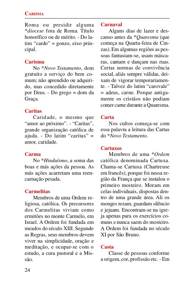 23. 23. 24 Roma ou presidir alguma *diocese fora de Roma. Título honorífico ou de mérito. - Do la- tim “cardo” = gonzo, eixo prin- cipal. Carisma No *Novo Testamento, dom gratuito a serviço do bem co- mum; não aprendido ou adquiri- do, mas concedido diretamente por Deus. - Do grego = dom da Graça. Caritas Caridade, o mesmo que “amor ao próximo”. - “Caritas”, grande organização católica de ajuda. - Do latim “caritas” = amor, caridade. Carma No *Hinduísmo, a soma das boas e más ações da pessoa. As más ações acarretam uma reen- carnação pesada. Carmelitas Membros de uma Ordem re- ligiosa, católica. Os precursores dos Carmelitas viviam como ermitões no monte Carmelo, em Israel. A Ordem foi fundada em meados do século XIII. Segundo as Regras, seus membros devem viver na simplicidade, oração e meditação, e ocupar-se com o estudo, a cura pastoral e a Mis- são. Carnaval Alguns dias de lazer e des- canso antes da *Quaresma (que começa na Quarta-feira de Cin- zas). Em algumas regiões as pes- soas fantasiam-se, usam másca- ras, cantam e dançam nas ruas. Certas normas de convivência social, aliás sempre válidas, dei- xam de vigorar temporariamen- te. - Talvez do latim “carovale” = adeus, carne. Porque antiga- mente os cristãos não podiam comer carne durante a Quaresma. Carta Nos cultos começa-se com essa palavra a leitura das Cartas do *Novo Testamento. Cartuxos Membros de uma *Ordem católica denominada Cartuxa. Chama-se Cartuxa (Chartreuse em francês), porque foi nessa re- gião da França que se instalou o primeiro mosteiro. Moram em celas individuais, dispostas den- tro de uma grande área. Ali os monges rezam, guardam silêncio e jejuam. Encontram-se na igre- ja apenas para os exercícios co- muns e nunca saem do mosteiro. A Ordem foi fundada no século XI por São Bruno. Casta Classe de pessoas conforme a origem, cor, profissão etc. - Em CARISMA