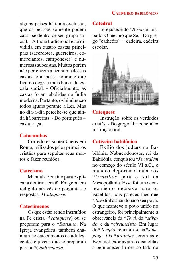 24. 24. 25 alguns países há tanta exclusão, que as pessoas somente podem casar-se dentro de seu grupo so- cial. - A Índia tradicional está di- vidida em quatro castas princi- pais (sacerdotes, guerreiros, co- merciantes, camponeses) e nu- merosas subcastas. Muitos porém não pertencem a nenhuma dessas castas; é a massa sobrante que fica no degrau mais baixo da es- cala social. - Oficialmente, as castas foram abolidas na Índia moderna. Portanto, os hindus são todos iguais perante a Lei. Mas no dia-a-dia percebe-se que ain- da há barreiras. - Do português = casta, raça. Catacumbas Corredores subterrâneos em Roma, utilizados pelos primeiros cristãos para sepultar seus mor- tos e fazer reuniões. Catecismo Manual de ensino para expli- car a doutrina cristã. Em geral era redigido através de perguntas e respostas. *Catequese. Catecúmenos Os que estão sendo instruídos na Fé cristã (*catequese) ou se preparam para o *Batismo. Na Igreja evangélica, também cha- mam-se catecúmenos os adoles- centes e jovens que se preparam para a *Confirmação. Catedral Igreja/sede do *Bispo ou bis- pado. O mesmo que Sé. - Do gre- go “cathedra” = cadeira, cadeira escolar. Catequese Instrução sobre as verdades cristãs. - Do grego “katechein” = instrução oral. Cativeiro babilônico Exílio dos judeus na Ba- bilônia. Nabucodonosor, rei da Babilônia,conquistou*Jerusalém no começo do século VI a.C., e mandou deportar a nata dos *israelitas para o sul da Mesopotâmia. Esse foi um acon- tecimento decisivo para os israelitas, pois pareceu-lhes que *Javétinhaabandonadoseupovo. O que manteve o povo unido no estrangeiro, foi principalmente a observância da *Torá, do *sába- do, e da *circuncisão. Em lugar do *Templo, reuniam-se na *sina- goga. Os *profetas Jeremias e Ezequiel exortavam os israelitas a permanecer firmes ao lado do CATIVEIRO BABILÔNICO