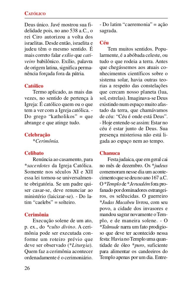 25. 25. 26 Deus único. Javé mostrou sua fi- delidade pois, no ano 538 a.C., o rei Ciro autorizou a volta dos israelitas. Desde então, israelita e judeu têm o mesmo sentido. É mais correto falar exílio que cati- veiro babilônico. Exílio, palavra de origem latina, significa perma- nência forçada fora da pátria. Católico Termo aplicado, as mais das vezes, no sentido de pertença à Igreja: É católico quem ou o que tem a ver com a Igreja católica. - Do grego “katholikos” = que abrange e que atinge tudo. Celebração *Cerimônia. Celibato Renúncia ao casamento, para *sacerdotes da Igreja Católica. Somente nos séculos XI e XII essa lei tornou-se universalmen- te obrigatória. Se um padre qui- ser casar-se, deve renunciar ao ministério (laicizar-se). - Do la- tim “caelebs” = solteiro. Cerimônia Execução solene de um ato, p. ex., do *culto divino. A ceri- mônia pode ser executada con- forme um roteiro prévio que deve ser observado (*Liturgia). Quem faz a cerimônia acontecer ordenadamente é o cerimoniário. - Do latim “caeremonia” = ação sagrada. Céu Tem muitos sentidos. Popu- larmente, é a abóbada celeste, ou tudo o que rodeia a terra. Antes que chegássemos aos atuais co- nhecimentos científicos sobre o sistema solar, havia outras teo- rias a respeito das constelações que cercam nosso planeta (lua, sol, estrelas). Imaginava-se Deus existindo num espaço muito afas- tado da terra, que chamávamos de céu: “Céu é onde está Deus”. - Hoje entende-se assim: Estar no céu é estar junto de Deus. Sua presença misteriosa não está li- gada ao espaço nem ao tempo. Chanuca Festajudaica,queemgeralcai no mês de dezembro. Os *judeus comemoram nesse dia um aconte- cimentoquesedeunoano167a.C. O*Templode*Jerusalémforapro- fanadopordominadoresestrangei- ros, os selêucidas. O guerreiro *Judas Macabeu livrou, com seu povo, a cidade dos invasores e mandou sagrar novamente oTem- plo, e de maneira solene. - O *Talmude narra um fato prodigio- so que deve ter acontecido nessa festa:HavianoTemploumaquan- tidade de óleo *puro, suficiente para alimentar os candeeiros do Templo apenas por um dia. Entre- CATÓLICO