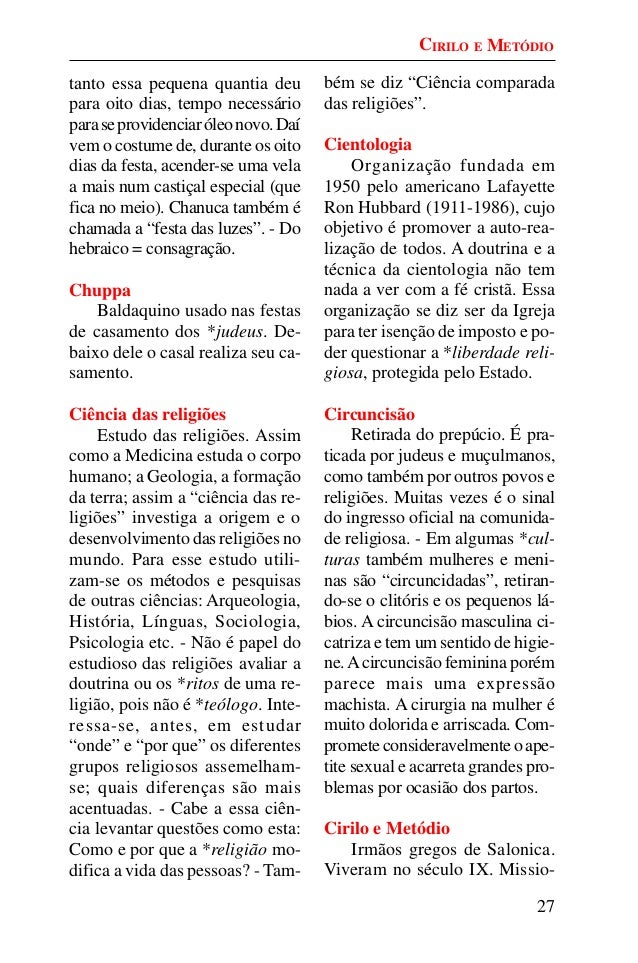 26. 26. 27 tanto essa pequena quantia deu para oito dias, tempo necessário paraseprovidenciaróleonovo.Daí vem o costume de, durante os oito dias da festa, acender-se uma vela a mais num castiçal especial (que fica no meio). Chanuca também é chamada a “festa das luzes”. - Do hebraico = consagração. Chuppa Baldaquino usado nas festas de casamento dos *judeus. De- baixo dele o casal realiza seu ca- samento. Ciência das religiões Estudo das religiões. Assim como a Medicina estuda o corpo humano; a Geologia, a formação da terra; assim a “ciência das re- ligiões” investiga a origem e o desenvolvimento das religiões no mundo. Para esse estudo utili- zam-se os métodos e pesquisas de outras ciências: Arqueologia, História, Línguas, Sociologia, Psicologia etc. - Não é papel do estudioso das religiões avaliar a doutrina ou os *ritos de uma re- ligião, pois não é *teólogo. Inte- ressa-se, antes, em estudar “onde” e “por que” os diferentes grupos religiosos assemelham- se; quais diferenças são mais acentuadas. - Cabe a essa ciên- cia levantar questões como esta: Como e por que a *religião mo- difica a vida das pessoas? - Tam- bém se diz “Ciência comparada das religiões”. Cientologia Organização fundada em 1950 pelo americano Lafayette Ron Hubbard (1911-1986), cujo objetivo é promover a auto-rea- lização de todos. A doutrina e a técnica da cientologia não tem nada a ver com a fé cristã. Essa organização se diz ser da Igreja para ter isenção de imposto e po- der questionar a *liberdade reli- giosa, protegida pelo Estado. Circuncisão Retirada do prepúcio. É pra- ticada por judeus e muçulmanos, como também por outros povos e religiões. Muitas vezes é o sinal do ingresso oficial na comunida- de religiosa. - Em algumas *cul- turas também mulheres e meni- nas são “circuncidadas”, retiran- do-se o clitóris e os pequenos lá- bios. A circuncisão masculina ci- catriza e tem um sentido de higie- ne.Acircuncisão feminina porém parece mais uma expressão machista. A cirurgia na mulher é muito dolorida e arriscada. Com- prometeconsideravelmenteoape- tite sexual e acarreta grandes pro- blemas por ocasião dos partos. Cirilo e Metódio Irmãos gregos de Salonica. Viveram no século IX. Missio- CIRILO E METÓDIO