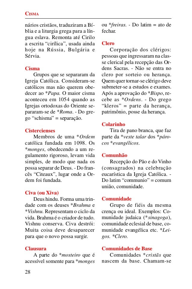 27. 27. 28 nários cristãos, traduziram a Bí- blia e a liturgia grega para a lín- gua eslava. Remonta até Cirilo a escrita “cirílica”, usada ainda hoje na Rússia, Bulgária e Sérvia. Cisma Grupos que se separaram da Igreja Católica. Consideram-se católicos mas não querem obe- decer ao *Papa. O maior cisma aconteceu em 1054 quando as Igrejas ortodoxas do Oriente se- pararam-se de *Roma. - Do gre- go “schisma” = separação. Cistercienses Membros de uma *Ordem católica fundada em 1098. Os *monges, obedecendo a um re- gulamento rigoroso, levam vida simples, de modo que nada os possa separar de Deus. - Do fran- cês “Citeaux”, lugar onde a Or- dem foi fundada. Civa (ou Xiva) Deus hindu. Forma uma trin- dade com os deuses *Brahma e *Vishnu. Representam o ciclo da vida. Brahma é o criador de tudo. Vishnu conserva. Civa destrói: Muita coisa deve desaparecer para que o novo possa surgir. Clausura A parte do *mosteiro que é acessível somente para *monges ou *freiras. - Do latim = ato de fechar. Clero Corporação dos clérigos: pessoas que ingressaram na clas- se clerical pela recepção das Or- dens Sacras. - Não se entra no clero por sorteio ou herança. Quem quer tornar-se clérigo deve submeter-se a estudos e exames. Após a aprovação do *Bispo, re- cebe as *Ordens. - Do grego “kleros” = parte da herança, patrimônio, posse da herança. Colarinho Tira de pano branca, que faz parte da *veste talar dos *páro- cos *evangélicos. Comunhão Recepção do Pão e do Vinho (consagrados) na celebração eucarística da Igreja Católica. - Do latim “communio” = comum união, comunidade. Comunidade Grupo de fiéis da mesma crença ou ideal. Exemplos: Co- munidade judaica (*sinagoga), comunidade eclesial de base, co- munidade evangélica etc. *Lei- gos. *Clero. Comunidades de Base Comunidades *cristãs que nascem da base. Chamam-se CISMA