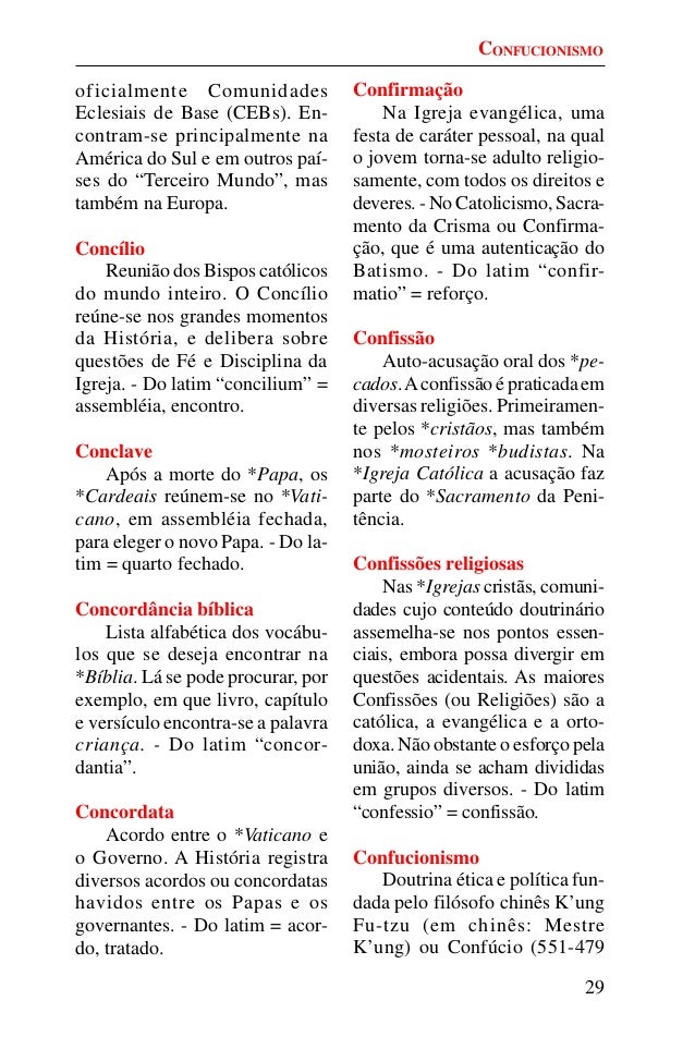 28. 28. 29 oficialmente Comunidades Eclesiais de Base (CEBs). En- contram-se principalmente na América do Sul e em outros paí- ses do “Terceiro Mundo”, mas também na Europa. Concílio Reunião dos Bispos católicos do mundo inteiro. O Concílio reúne-se nos grandes momentos da História, e delibera sobre questões de Fé e Disciplina da Igreja. - Do latim “concilium” = assembléia, encontro. Conclave Após a morte do *Papa, os *Cardeais reúnem-se no *Vati- cano, em assembléia fechada, para eleger o novo Papa. - Do la- tim = quarto fechado. Concordância bíblica Lista alfabética dos vocábu- los que se deseja encontrar na *Bíblia. Lá se pode procurar, por exemplo, em que livro, capítulo e versículo encontra-se a palavra criança. - Do latim “concor- dantia”. Concordata Acordo entre o *Vaticano e o Governo. A História registra diversos acordos ou concordatas havidos entre os Papas e os governantes. - Do latim = acor- do, tratado. Confirmação Na Igreja evangélica, uma festa de caráter pessoal, na qual o jovem torna-se adulto religio- samente, com todos os direitos e deveres. - No Catolicismo, Sacra- mento da Crisma ou Confirma- ção, que é uma autenticação do Batismo. - Do latim “confir- matio” = reforço. Confissão Auto-acusação oral dos *pe- cados.Aconfissão é praticada em diversas religiões. Primeiramen- te pelos *cristãos, mas também nos *mosteiros *budistas. Na *Igreja Católica a acusação faz parte do *Sacramento da Peni- tência. Confissões religiosas Nas *Igrejas cristãs, comuni- dades cujo conteúdo doutrinário assemelha-se nos pontos essen- ciais, embora possa divergir em questões acidentais. As maiores Confissões (ou Religiões) são a católica, a evangélica e a orto- doxa. Não obstante o esforço pela união, ainda se acham divididas em grupos diversos. - Do latim “confessio” = confissão. Confucionismo Doutrina ética e política fun- dada pelo filósofo chinês K’ung Fu-tzu (em chinês: Mestre K’ung) ou Confúcio (551-479 CONFUCIONISMO