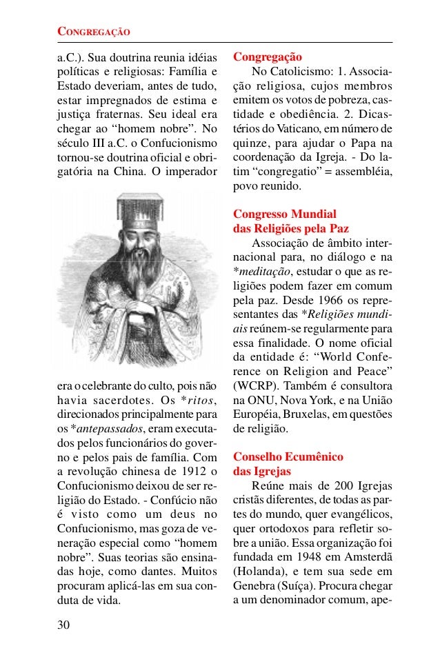 29. 29. 30 a.C.). Sua doutrina reunia idéias políticas e religiosas: Família e Estado deveriam, antes de tudo, estar impregnados de estima e justiça fraternas. Seu ideal era chegar ao “homem nobre”. No século III a.C. o Confucionismo tornou-se doutrina oficial e obri- gatória na China. O imperador era o celebrante do culto, pois não havia sacerdotes. Os *ritos, direcionados principalmente para os *antepassados, eram executa- dos pelos funcionários do gover- no e pelos pais de família. Com a revolução chinesa de 1912 o Confucionismo deixou de ser re- ligião do Estado. - Confúcio não é visto como um deus no Confucionismo, mas goza de ve- neração especial como “homem nobre”. Suas teorias são ensina- das hoje, como dantes. Muitos procuram aplicá-las em sua con- duta de vida. Congregação No Catolicismo: 1. Associa- ção religiosa, cujos membros emitem os votos de pobreza, cas- tidade e obediência. 2. Dicas- térios doVaticano, em número de quinze, para ajudar o Papa na coordenação da Igreja. - Do la- tim “congregatio” = assembléia, povo reunido. Congresso Mundial das Religiões pela Paz Associação de âmbito inter- nacional para, no diálogo e na *meditação, estudar o que as re- ligiões podem fazer em comum pela paz. Desde 1966 os repre- sentantes das *Religiões mundi- ais reúnem-se regularmente para essa finalidade. O nome oficial da entidade é: “World Confe- rence on Religion and Peace” (WCRP). Também é consultora na ONU, Nova York, e na União Européia, Bruxelas, em questões de religião. Conselho Ecumênico das Igrejas Reúne mais de 200 Igrejas cristãs diferentes, de todas as par- tes do mundo, quer evangélicos, quer ortodoxos para refletir so- bre a união. Essa organização foi fundada em 1948 em Amsterdã (Holanda), e tem sua sede em Genebra (Suíça). Procura chegar a um denominador comum, ape- CONGREGAÇÃO