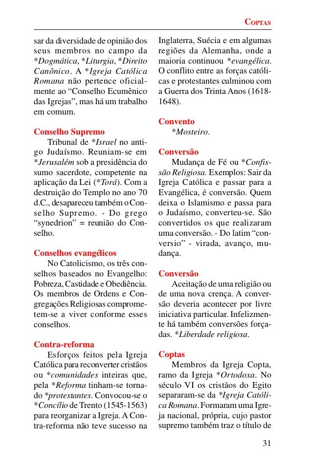 30. 30. 31 sar da diversidade de opinião dos seus membros no campo da *Dogmática, *Liturgia, *Direito Canônico. A *Igreja Católica Romana não pertence oficial- mente ao “Conselho Ecumênico das Igrejas”, mas há um trabalho em comum. Conselho Supremo Tribunal de *Israel no anti- go Judaísmo. Reuniam-se em *Jerusalém sob a presidência do sumo sacerdote, competente na aplicação da Lei (*Torá). Com a destruição do Templo no ano 70 d.C., desapareceu também o Con- selho Supremo. - Do grego “synedrion” = reunião do Con- selho. Conselhos evangélicos No Catolicismo, os três con- selhos baseados no Evangelho: Pobreza, Castidade e Obediência. Os membros de Ordens e Con- gregações Religiosas comprome- tem-se a viver conforme esses conselhos. Contra-reforma Esforços feitos pela Igreja Católica para reconverter cristãos ou *comunidades inteiras que, pela *Reforma tinham-se torna- do *protestantes. Convocou-se o *Concílio de Trento (1545-1563) para reorganizar a Igreja.A Con- tra-reforma não teve sucesso na Inglaterra, Suécia e em algumas regiões da Alemanha, onde a maioria continuou *evangélica. O conflito entre as forças católi- cas e protestantes culminou com a Guerra dos Trinta Anos (1618- 1648). Convento *Mosteiro. Conversão Mudança de Fé ou *Confis- são Religiosa. Exemplos: Sair da Igreja Católica e passar para a Evangélica, é conversão. Quem deixa o Islamismo e passa para o Judaísmo, converteu-se. São convertidos os que realizaram uma conversão. - Do latim “con- versio” - virada, avanço, mu- dança. Conversão Aceitação de uma religião ou de uma nova crença. A conver- são deveria acontecer por livre iniciativa particular. Infelizmen- te há também conversões força- das. *Liberdade religiosa. Coptas Membros da Igreja Copta, ramo da Igreja *Ortodoxa. No século VI os cristãos do Egito separaram-se da *Igreja Católi- ca Romana. Formaram uma Igre- ja nacional, própria, cujo pastor supremo também traz o título de COPTAS
