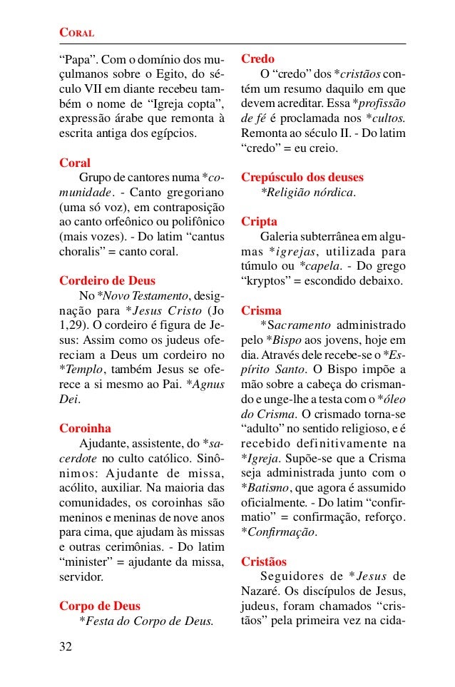 31. 31. 32 “Papa”. Com o domínio dos mu- çulmanos sobre o Egito, do sé- culo VII em diante recebeu tam- bém o nome de “Igreja copta”, expressão árabe que remonta à escrita antiga dos egípcios. Coral Grupo de cantores numa *co- munidade. - Canto gregoriano (uma só voz), em contraposição ao canto orfeônico ou polifônico (mais vozes). - Do latim “cantus choralis” = canto coral. Cordeiro de Deus No *Novo Testamento, desig- nação para *Jesus Cristo (Jo 1,29). O cordeiro é figura de Je- sus: Assim como os judeus ofe- reciam a Deus um cordeiro no *Templo, também Jesus se ofe- rece a si mesmo ao Pai. *Agnus Dei. Coroinha Ajudante, assistente, do *sa- cerdote no culto católico. Sinô- nimos: Ajudante de missa, acólito, auxiliar. Na maioria das comunidades, os coroinhas são meninos e meninas de nove anos para cima, que ajudam às missas e outras cerimônias. - Do latim “minister” = ajudante da missa, servidor. Corpo de Deus *Festa do Corpo de Deus. Credo O “credo” dos *cristãos con- tém um resumo daquilo em que devem acreditar. Essa *profissão de fé é proclamada nos *cultos. Remonta ao século II. - Do latim “credo” = eu creio. Crepúsculo dos deuses *Religião nórdica. Cripta Galeria subterrânea em algu- mas *igrejas, utilizada para túmulo ou *capela. - Do grego “kryptos” = escondido debaixo. Crisma *Sacramento administrado pelo *Bispo aos jovens, hoje em dia.Através dele recebe-se o *Es- pírito Santo. O Bispo impõe a mão sobre a cabeça do crisman- do e unge-lhe a testa com o *óleo do Crisma. O crismado torna-se “adulto” no sentido religioso, e é recebido definitivamente na *Igreja. Supõe-se que a Crisma seja administrada junto com o *Batismo, que agora é assumido oficialmente. - Do latim “confir- matio” = confirmação, reforço. *Confirmação. Cristãos Seguidores de *Jesus de Nazaré. Os discípulos de Jesus, judeus, foram chamados “cris- tãos” pela primeira vez na cida- CORAL