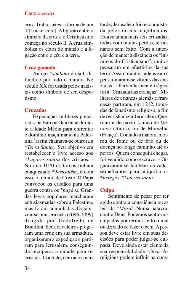 33. 33. 34 cruz. Tinha, antes, a forma de um T (t maiúsculo).A ligação entre o símbolo da cruz e o Cristianismo começa no século II. A cruz sim- boliza os eixos do mundo e a li- gação entre o céu e a terra. Cruz gamada Antigo *símbolo do sol, di- fundido por todo o mundo. No século XX foi usada pelos nazis- tas como símbolo de seu despo- tismo. Cruzadas Expedições militares prepa- radas na Europa Ocidental duran- te a Idade Média para enfrentar o domínio muçulmano na Pales- tina (assim chamava-se outrora a *Terra Santa). Seu objetivo era restabelecer o livre acesso aos *Lugares santos dos cristãos. - No ano 1070 os turcos tinham conquistado *Jerusalém, e com isso, o túmulo de Cristo. O Papa convocou os cristãos para uma guerra contra os *pagãos. Gran- des levas populares marcharam entusiasmadas sobre a Palestina, mas foram aniquiladas. Organi- zou-se uma cruzada (1096-1099) dirigida por Godofredo de Bouillon. Seus cavaleiros prega- ram uma cruz em sua armadura, organizaram a expedição e parti- ram para Jerusalém, conseguin- do recuperar a cidade para os cristãos. Contudo, cem anos mais tarde, Jerusalém foi reconquista- da pelos turcos muçulmanos. Houve ainda mais seis cruzadas, todas com muitas perdas, termi- nando sem êxito. Com a inten- ção de manter à distância os “ini- migos do Cristianismo”, muitos pensaram em afastá-los da sua terra. Assim muitos judeus euro- peus tornaram-se vítimas das cru- zadas. - Particularmente trágica foi a “Cruzada das crianças”. Mi- lhares de crianças alemãs e fran- cesas partiram, em 1212, toma- das de fanatismo religioso, a fim de recristianizar Jerusalém. Que- riam ir de navio, saindo de Gê- nova (Itália), ou de Marselha (França). Contudo a maioria mor- reu de fome ou de frio ou de doença no longo caminho até os portos. Quem conseguiu chegar, foi vendido como escravo. - Or- ganizaram-se também cruzadas semelhantes para aniquilar os *hereges. *Guerra santa. Culpa Sentimento de pesar por ter agido contra a consciência ou as leis da *Moral. Numa palavra, contra Deus. Podemos sentir-nos culpados por termos feito o mal ou deixado de fazer o bem.Apes- soa deve estar livre em suas de- cisões para poder julgar-se cul- pada. Deve ainda estar ciente da sua responsabilidade *ética. As religiões podem influir na cons- CRUZ GAMADA